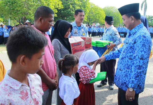 Fahmi memberikan bantuan secara simbolis kepada 18 perwakilan pelajar Sulteng saat upacara hari kesadaran nasional, di Kantor Bupati Majene, Rabu pagi. Bantuan tersebut di antaranya berupa seragam sekolah dan paket makanan.