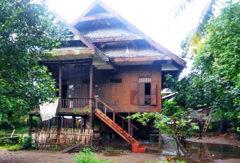 Kondisi rumah juga masih cukup kokoh dan cukup terawat. Dari depan, tangga rumah panggung itu terbuat dari semen dengan hiasan susunan keramik yang mengkilat. Pun demikian dengan pekarangan rumah yang ditumbuhi tanaman-tanaman dan rerumputan hias.
