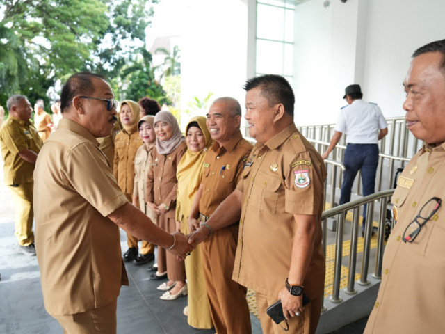 Di hari pertamanya ngantor, SDK bersama Wagub, Salim S Mengga disambut para ASN dan non ASN lingkup Pemerintah Provinsi Sulbar di halaman Kantor Gubernur Sulbar.